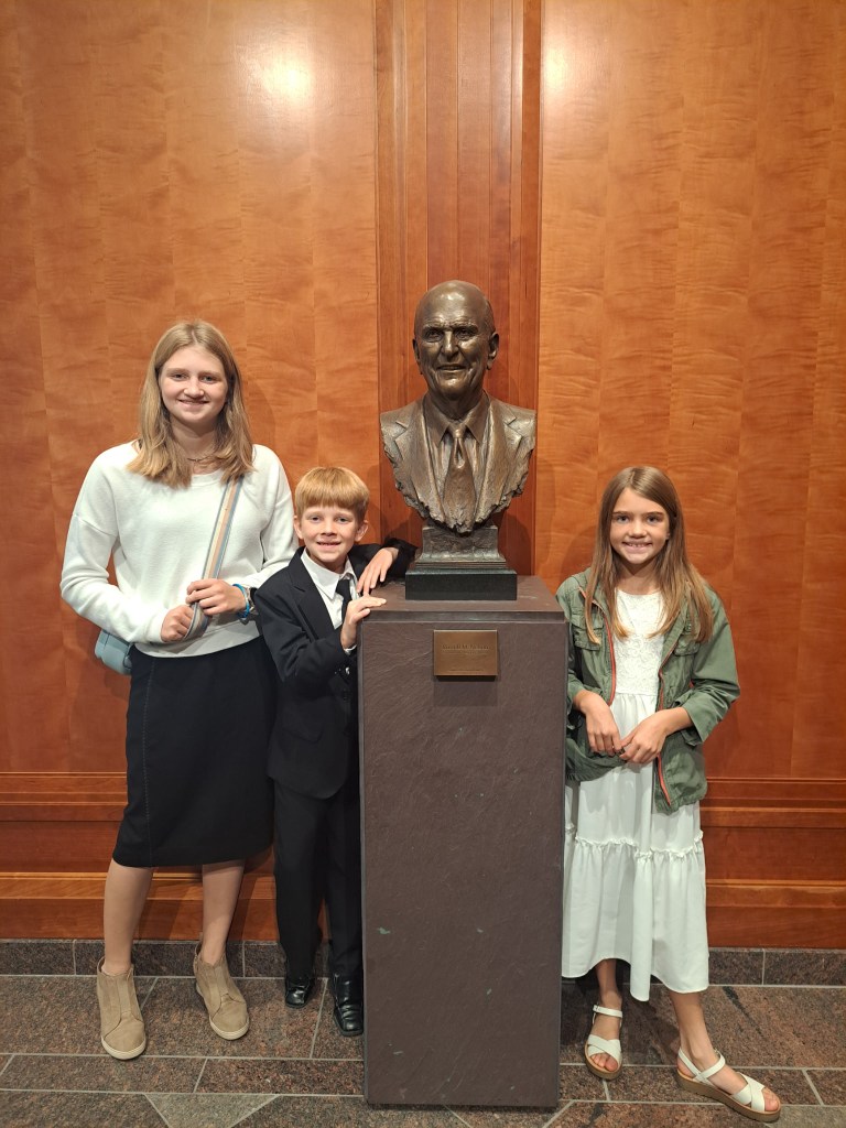 Aliza, James, and Lillian Ross with President Russell M Nelson’s bust