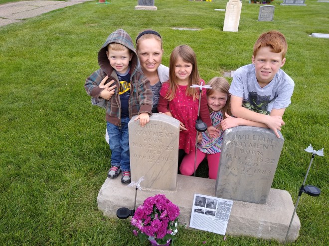 Bryan Hemsley, Amanda, Aliza, and Hiram Ross with tombstones of Ann Reed (1852-1931) and Joseph Wayment (1844-1931). Amanda’s Great Great Great Grandparents on 24 May 2020.