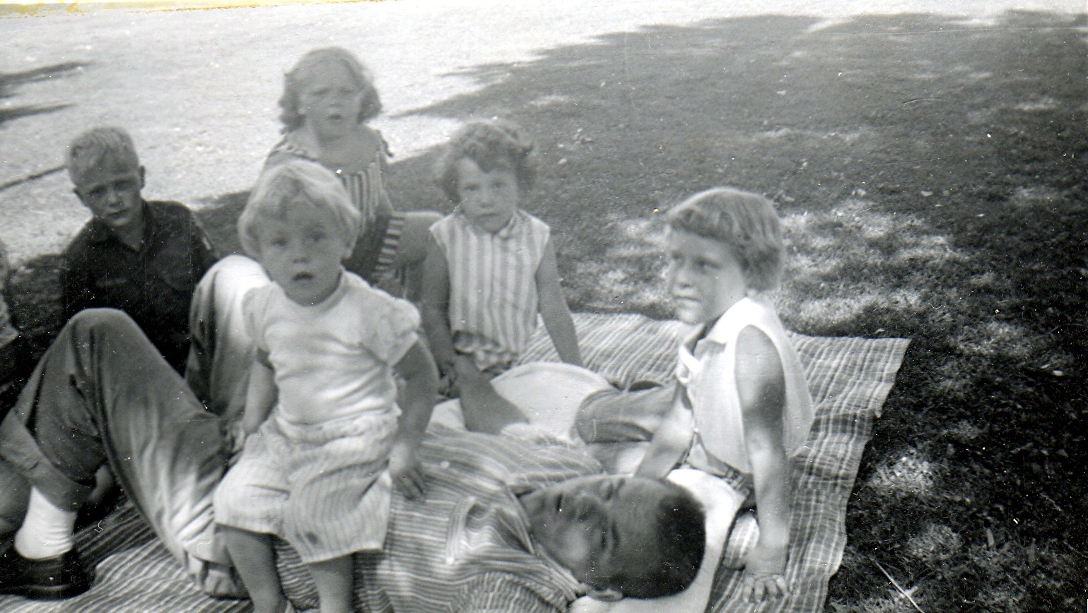 Jimmie, Lillian, and Lona Jonas with Norene and little Spence about 1948 (Lillian has a beet knife in hand, must have been fall)