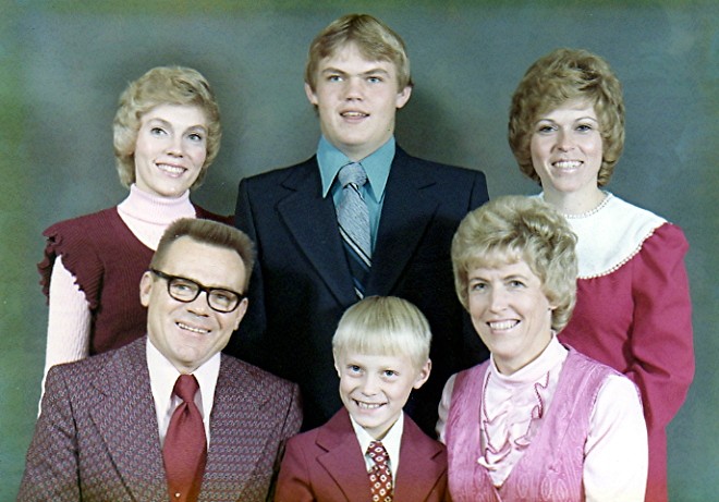 Front (l-r): Spence, Joe, Ellis, Evan, Paul Ross, Jackie Jonas, Andra Ross. Standing: Jimmie, Hilma, Lillian, Lillian, LeReta, Lona, Colleen. Back: Dan Jonas, Larry Talbot, Unknown hidden, Unknown hidden in 1982