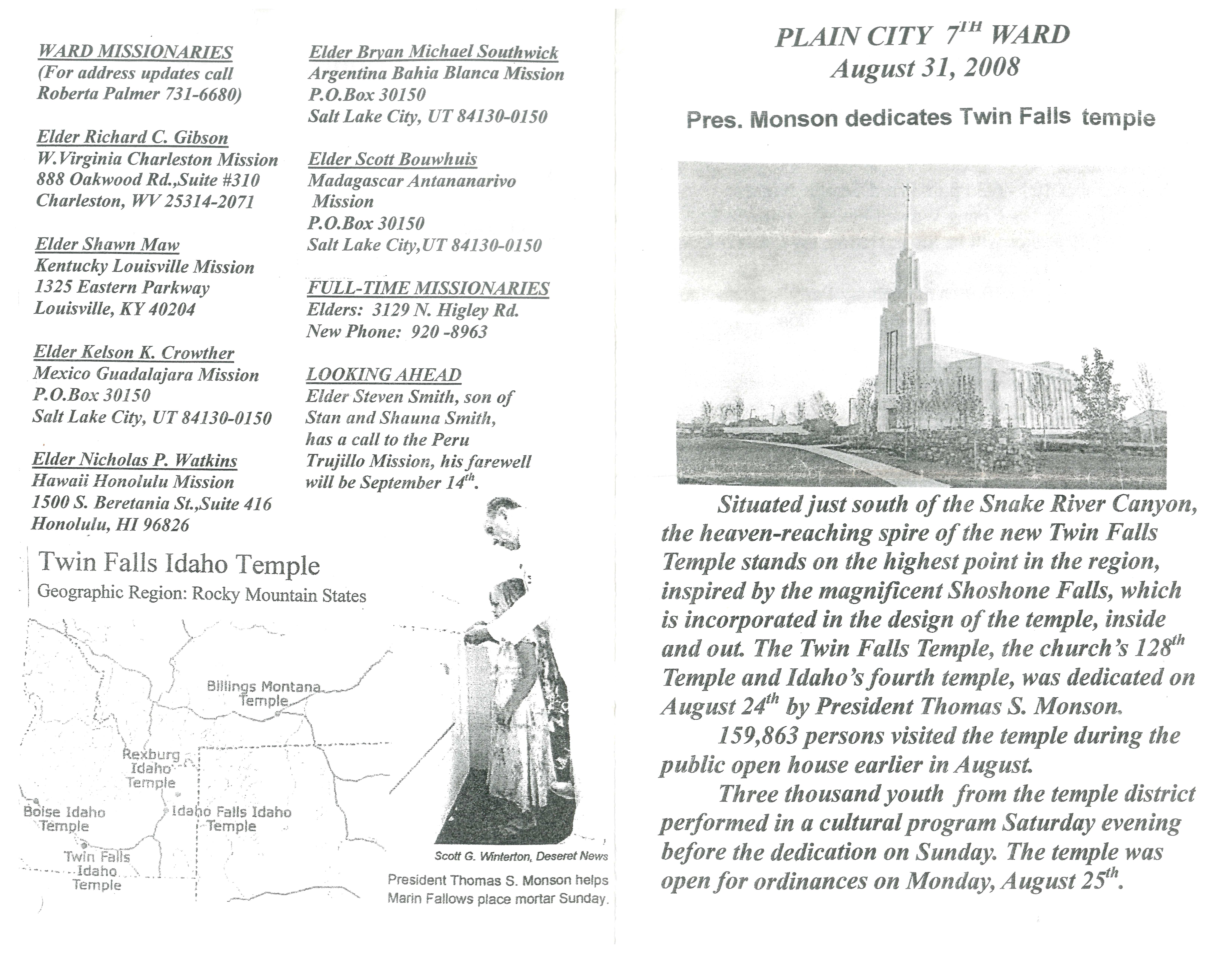Milo Ross found it full circle that the Plain City 7th Ward bulletin included information on the Twin Falls Idaho Temple Dedication
