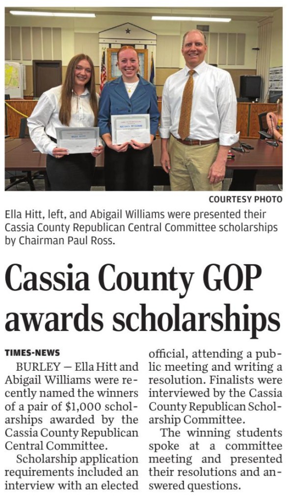 “Burley – Ella Hitt and Abigail Williams were recently named the winners of a pair of $1,000 scholarships awarded by the Cassia County Republican Central Committee.